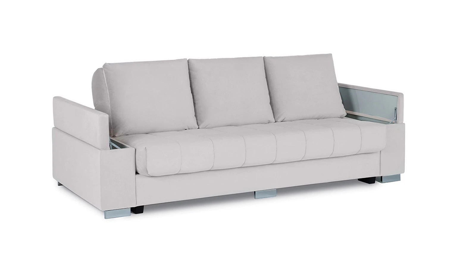 The armrests have built-in storage space. The lid opens laterally, which allows access to the storage space without getting up from the sofa.